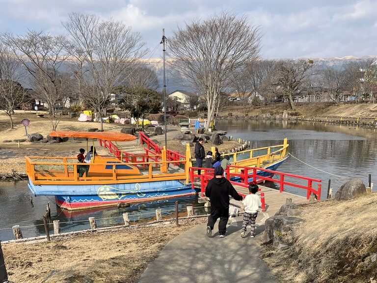 鯉や鴨?がいます。釣船ぐらいのサイズの船を浮かべて橋のようにしてあり、自由に乗れる少し揺れるのが楽しいです。杭とロープがあるので水には触れません。正直あまり池の水は綺麗そうではないので、これはこれで安心。
