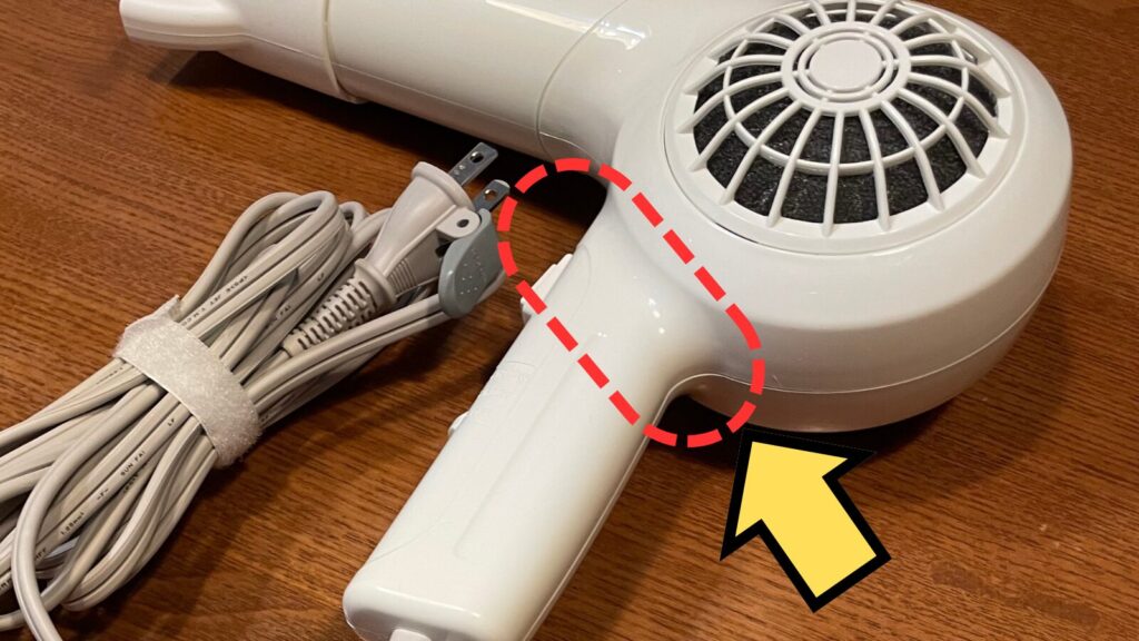 ずっと温風当ててると熱いので美容師さんみたいに振って使うクセがあります。そうするとドライヤーの折り畳む部分が使っていくうちにユルユルになって壊れるんです。(矢印のとこ)